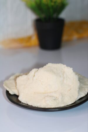 Made from cassava. It can be paired with grinded pepper, stew, soup, or sauce.